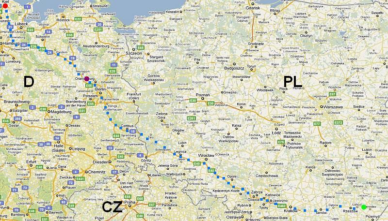In einem Rutsch ging es am Montag 900 Kilometer bis nördlich Berlin. Fehrbellin Flugplatz. Dort hatten wir wieder warme 13°C! An der PL-D-Grenze Plastikzeug für den Garten. A 900km run north of Berlin, where we spent a warm night at nice 13°C at the Fehrbellin airport. At the PL-D border this plastic garden stuff. |