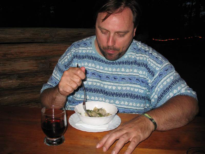 On the search for another camping ground (>>Sat-Navigation, haha) we steeped on a strange gravel road. Okay, again no place for us. On the parallel running main road we found this restaurant. Pelmeni. Chicken with fries. Lousy and unable waiters looking only for their off time. Not a wonder that the income level is so low.. |