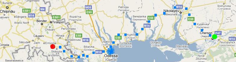 Durch Cherson am nächsten Morgen und vorbei an Nikolajev nach Odessa. Gut ausgebaut, beherrschbare Teilnahme am Straßenverkehr ist möglich. Through Cherson and passing Nikolajev we went to Odessa. Good finnish and a same good possibility to take part at the traffic. Well done. |
