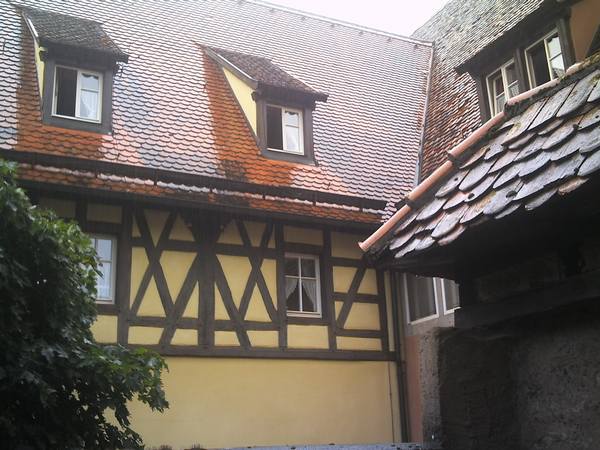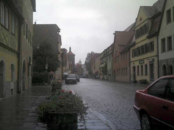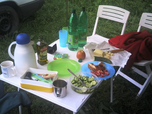 Further on north, rain at last. Great. The leak in the Wohni (our caravan) seems to be a small peace of sealing gasket, which work not, because its simply not there! Hmpf! Without heavy rain we have only clamminess of our own breathing in the caravan, that pearls down the inner walls. This demands to air it in the morning before departure. Here, near Ellwangen: Breakfast aka Ontbyt.