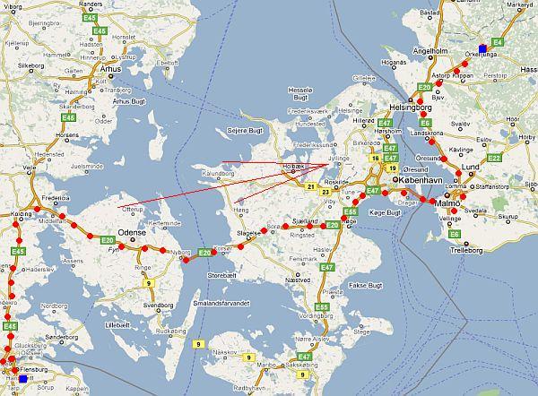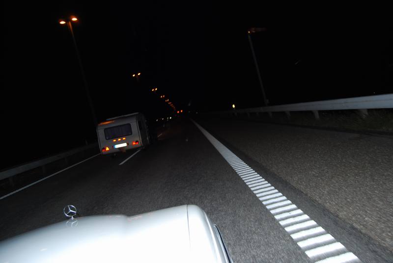 Nach dem Flensburger Alteimertreffen ging es gegen 18 Uhr gemütlich los. Wir setzten uns Jönköping als loses Ziel. 646 km zeigte das Navi an. An der deutsch-dänischen Grenze kauften wir noch Getränke ein, da es dort pfandfreie Dosen gab. Unser Reisewagen war ein Mercedes-Benz W123 200D, Kosename Dünomat, nachdem der Vorbesitzer damit vor einigen Jahren bis nach Dakar (Senegal) gefahren ist und das Auto im W123-Forum diesen Namen erhielt. Die damals erfolgte Höherlegung hat er vor dem Verkauf rückgängig gemacht und den Wagen sinnwidrigerweise tiefergelegt. Die abgesägten Federn sorgten bei unserer Beladung dafür, daß der Wagen hinten unglaublich tief hin. Wir hatten Gepäck, Getränke, Konserven und über 250 Liter Pflanzenöl dabei. Bei starken Bodenwellen setzte das Auspuffrohr auf. Das Pflanzenöl sollte die Reisekosten senken, wir wollten damit bis ans Nordkap kommen. Ich hatte vor Fahrtantritt noch bei der Ölmühle Kastellaun alle verfügbaren Kanister vollgetankt und mitgenommen. Wir fuhren über Padborg nach Kolding und über die Brücken. Die Storebælt- und die Öresundbrücke zogen an uns vorbei. Mautkosten: Storebælt 215 DKK, Öresund 275 DKK für einen Pkw ohne Anhänger. In Malmö hielten wir zum Tanken und zogen weiter über die E6 und später die E4, da wir Kurs auf Jönköping nahmen. 100 km hinter Malmö fuhren wir von der Europastraße ab und in das nächste Industriegebiet. An einem Wendehammer schlugen wir unser "Camp" auf. Nach einer Nachtbrotzeit ging es in's Bett. Für uns hieß das: In's Auto. Lehnen nach hinten und auf dem Gestühl gepennt. Zeltaufstellen war hier nicht möglich. |