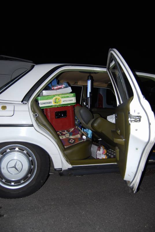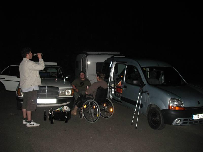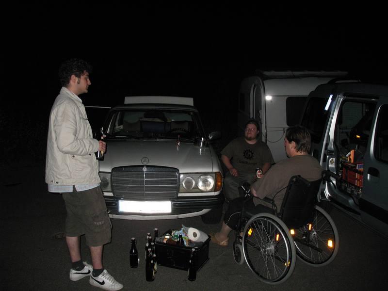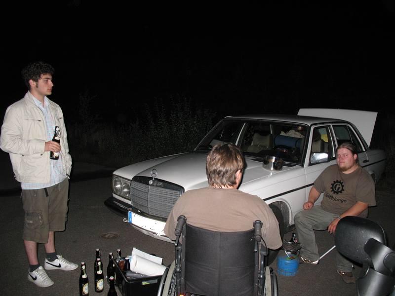 After taking part at the FAT we started easygoing at 6pm. We bought beer and soft drinks at the danish border. Our tourer was a Mercedes-Benz W123/200D, named DUENOMAT by the former owner, who has taken the car to Dakar/Senegal before. Before selling it to me, he put the shortened coils back in, so that the car is now deeper then ever. Our luggage, drinks, foodcans and over 250l of vegetable oil were the reason for dipping our exhaust to the ground many times. The plantoil we took to lower the fuel costs should be enough fuel to reach the north cape. We passed Padborg and Kolding, and went over the big bridges: Little Belt (free), Big Belt (215dkk) and Oeresund (275dkk) for a single car. Refueling at Malmoe we went up via E6 and the E4, heading for Joenkoeping. 100 km further we drove away from the highway into the next industrial zone and built up our "camp". After a late night supper we went to bed. For Taylan and me that ment sleeping on the seats in our car since we had no possibility to built up a tent. |
