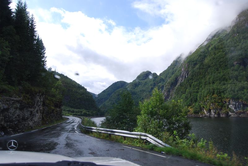 Wir pennten nicht so lange wie die letzten Tage. Gegen 11 Uhr kamen wir los. Taylan teilte mir mit, daß er das Wichtigste gesehen habe. Er schlug vor, jetzt schon Kurs auf die Heimat zu nehmen um noch ein oder zwei Tage in Hamburg zu verbringen, wo wir bei einem Freund von ihm unterkommen konnten. Ich wäre zwar noch gerne etwas länger hier bei den Fjorden geblieben, doch mit den vielen Fähren läppert sich das doch schon arg. Also wurde das Navi erstmal auf Svinesund an der norwegisch-schwedischen Grenze eingestellt, dort wollte ich den Benz wieder volltanken. Das Navi zeigte um die 700 km Distanz ein. Ich dachte also, der Wagen würde ohne weiteren Tankstopp bis zur Grenze auskommen. Der verbaute 80-Liter-Tank ist schon etwas Feines. |