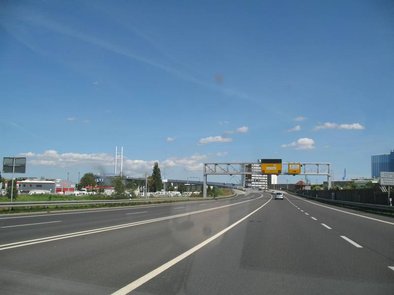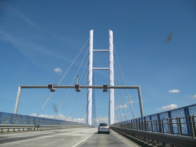 From Loecknitz to Stralsund we missed - again - the taking of pictures. In Loecknitz we spent the night in front of the local towing service, where we bought the caravan four years back. Quiet and cold it was. We had breakfast at clear blue skies with lots of stuff we got in far off countries and after that we went northwestbound on the beautiful countryroad; to the island Ruegen, which we reached by passing the new Ruegenbridge: |